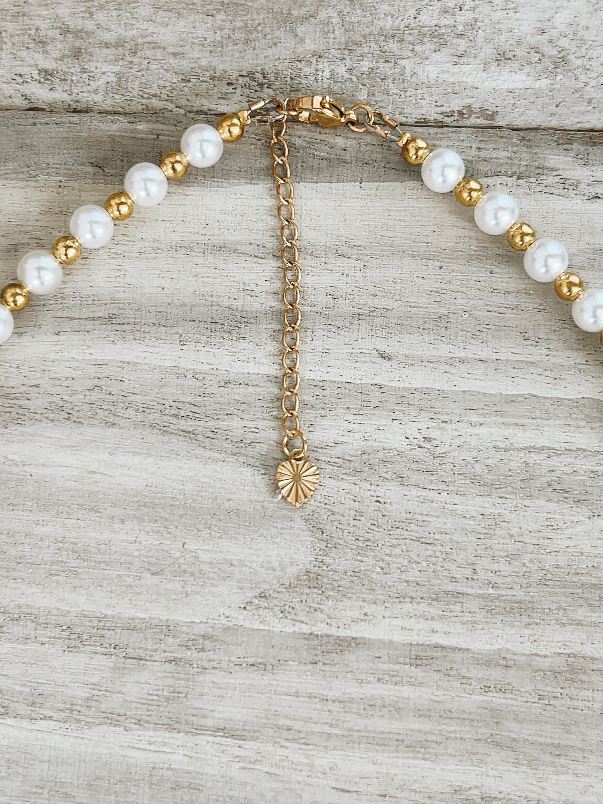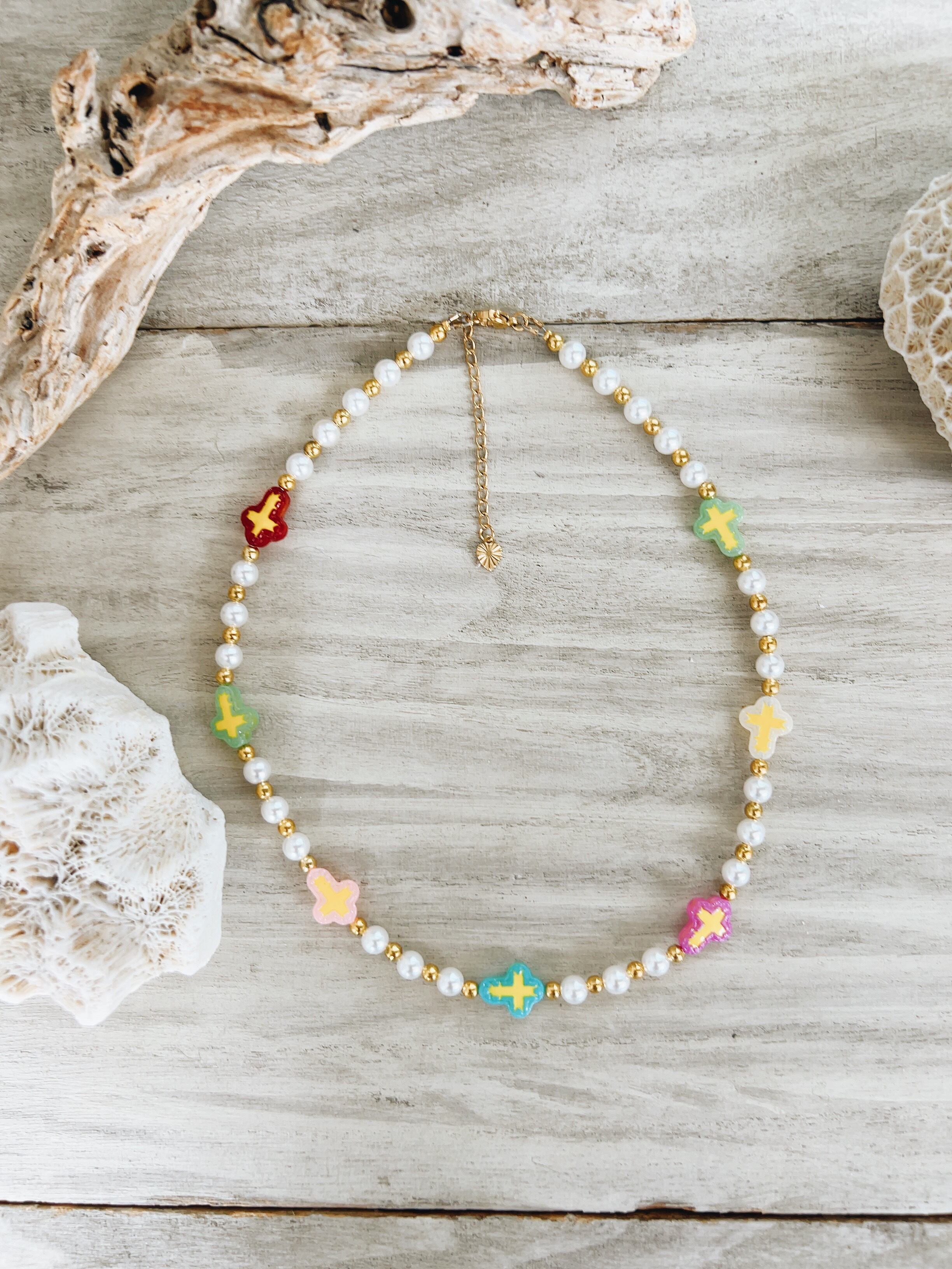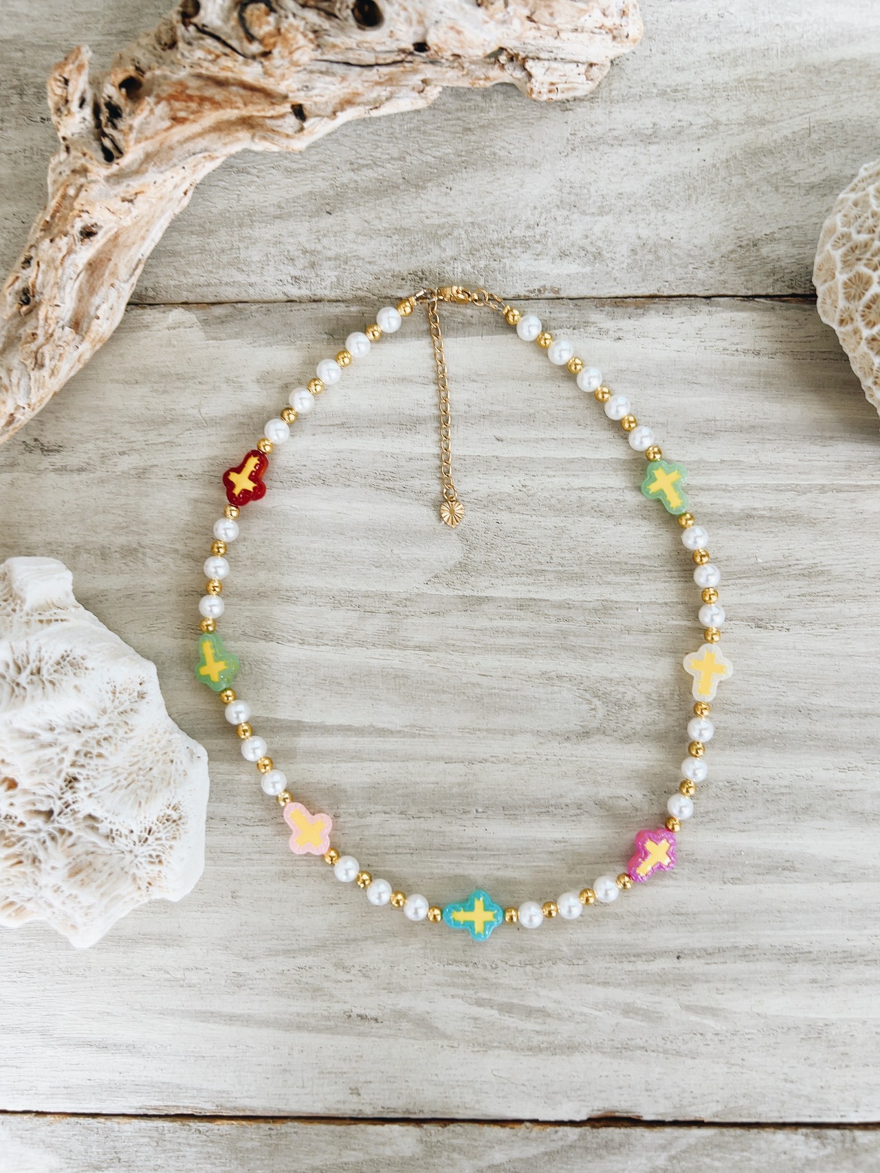 カラフルなクロスのアクリルビーズとシェルパールを合わせたネックレス。パールとパールの間にはゴールドのステンレスビーズを使用しています。