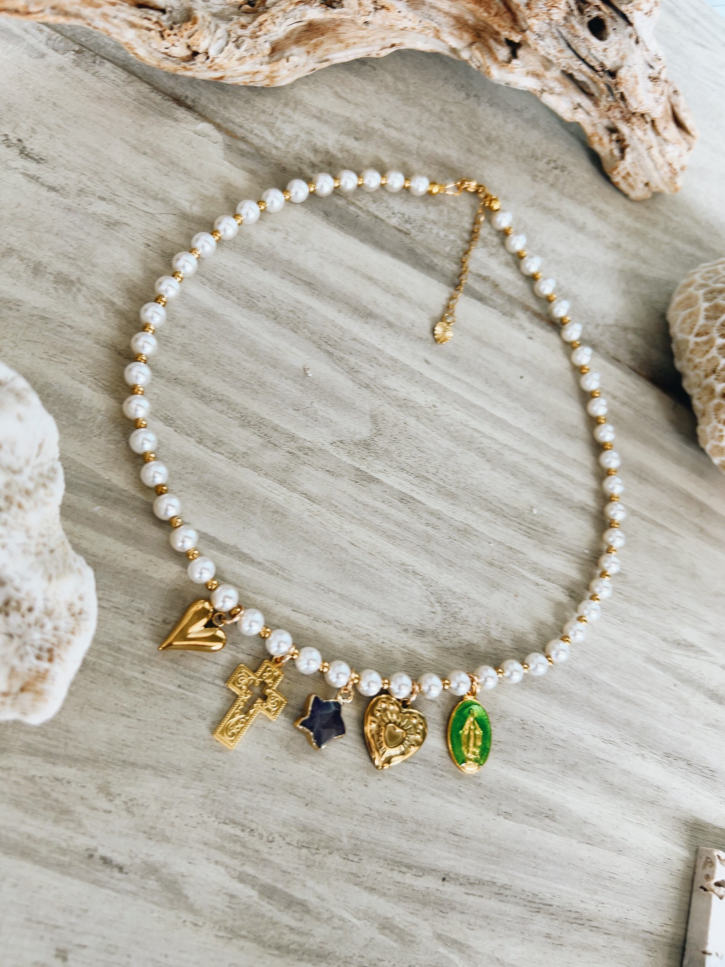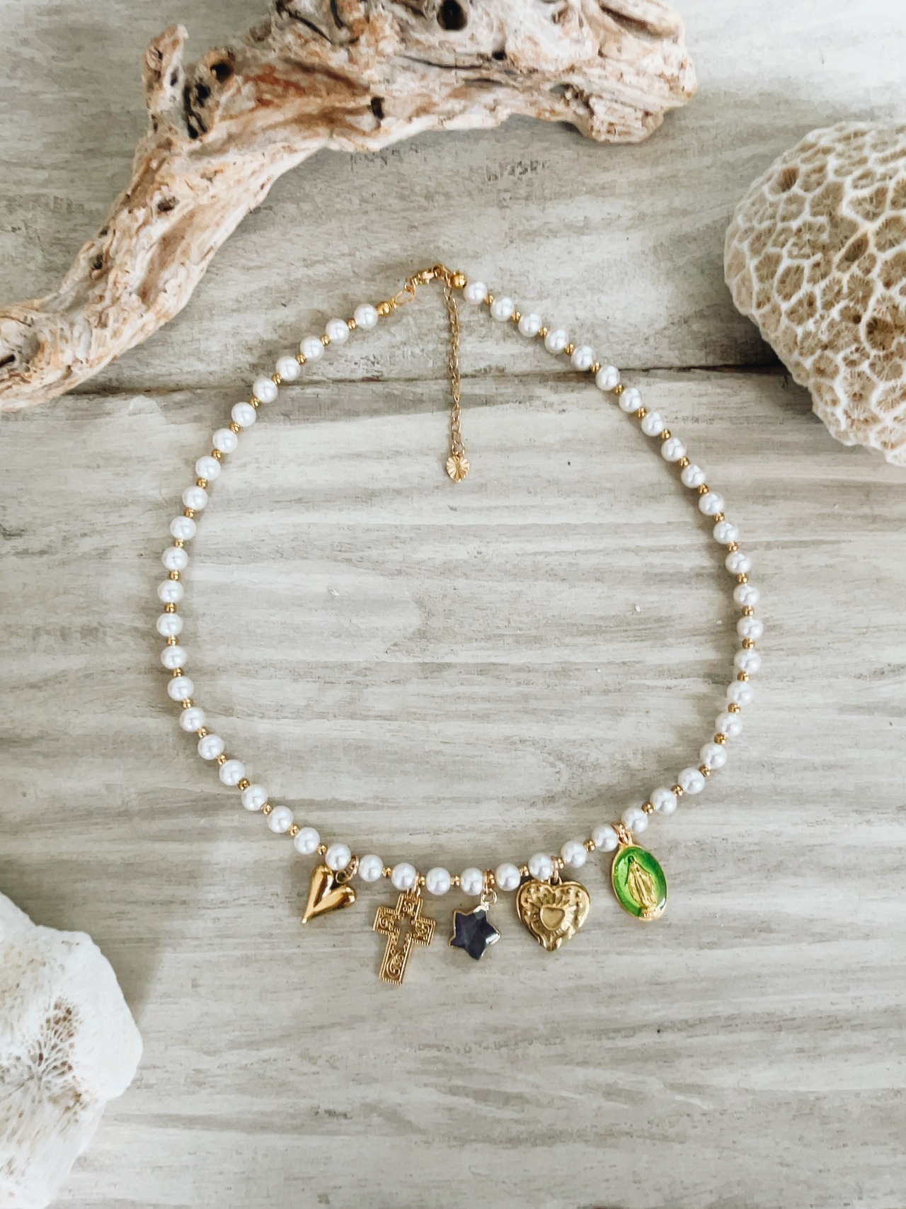 シェルパールとゴールドのステンレスビーフのネックレスにガーランドのようにチャームを合わせました。