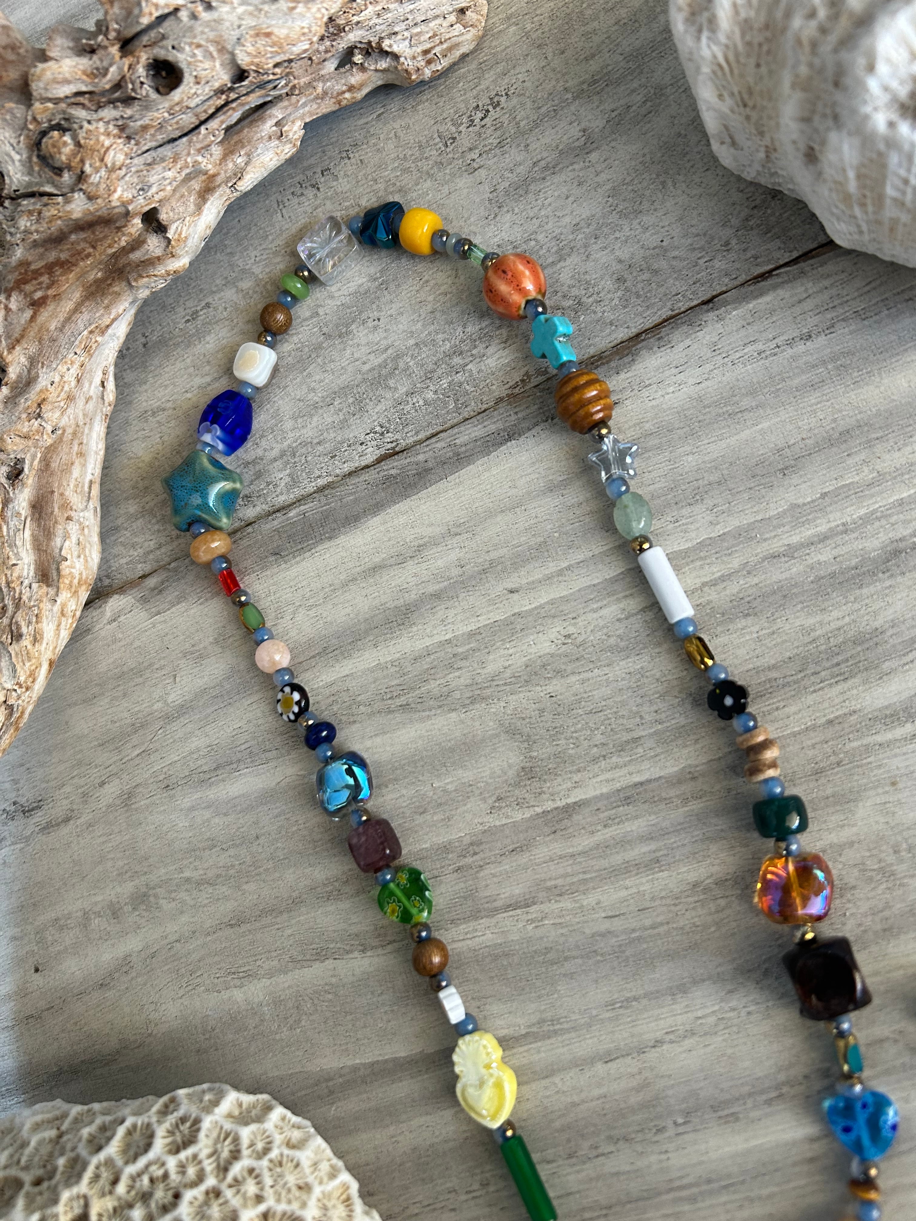 天然石、ガラス、陶器、ウッドなど様々な素材を組み合わせたロングネックレスです。