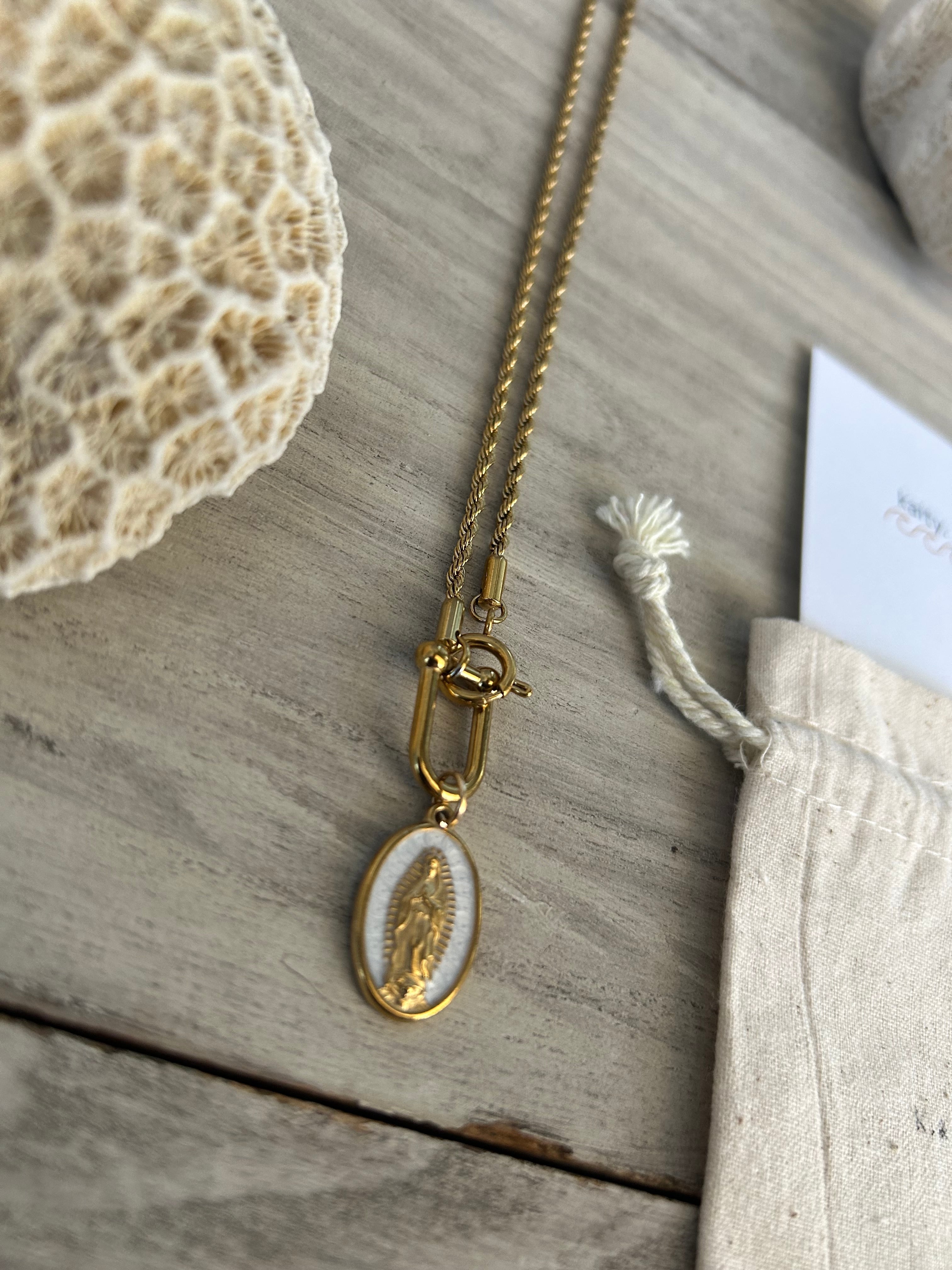 存在感のあるロープチェーンとホワイトベースのメダイチャームを合わせました。