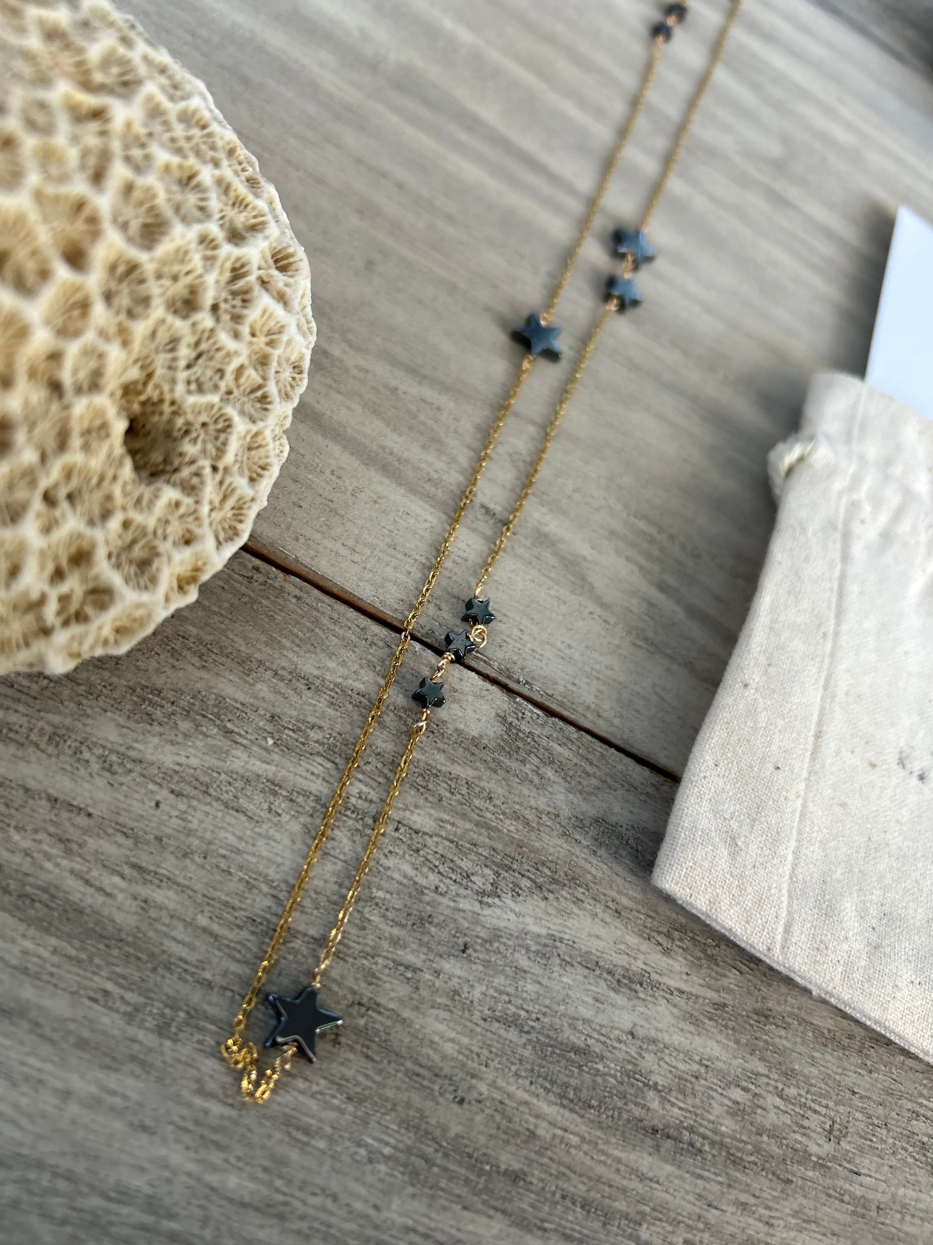 光沢のある黒いヘマタイトと華奢なチェーンを一つ一つバランスを見ながら繋いだネックレスです。ヘマタイトの星は3種類のサイズ違いのものを合わせて動きを出しています。