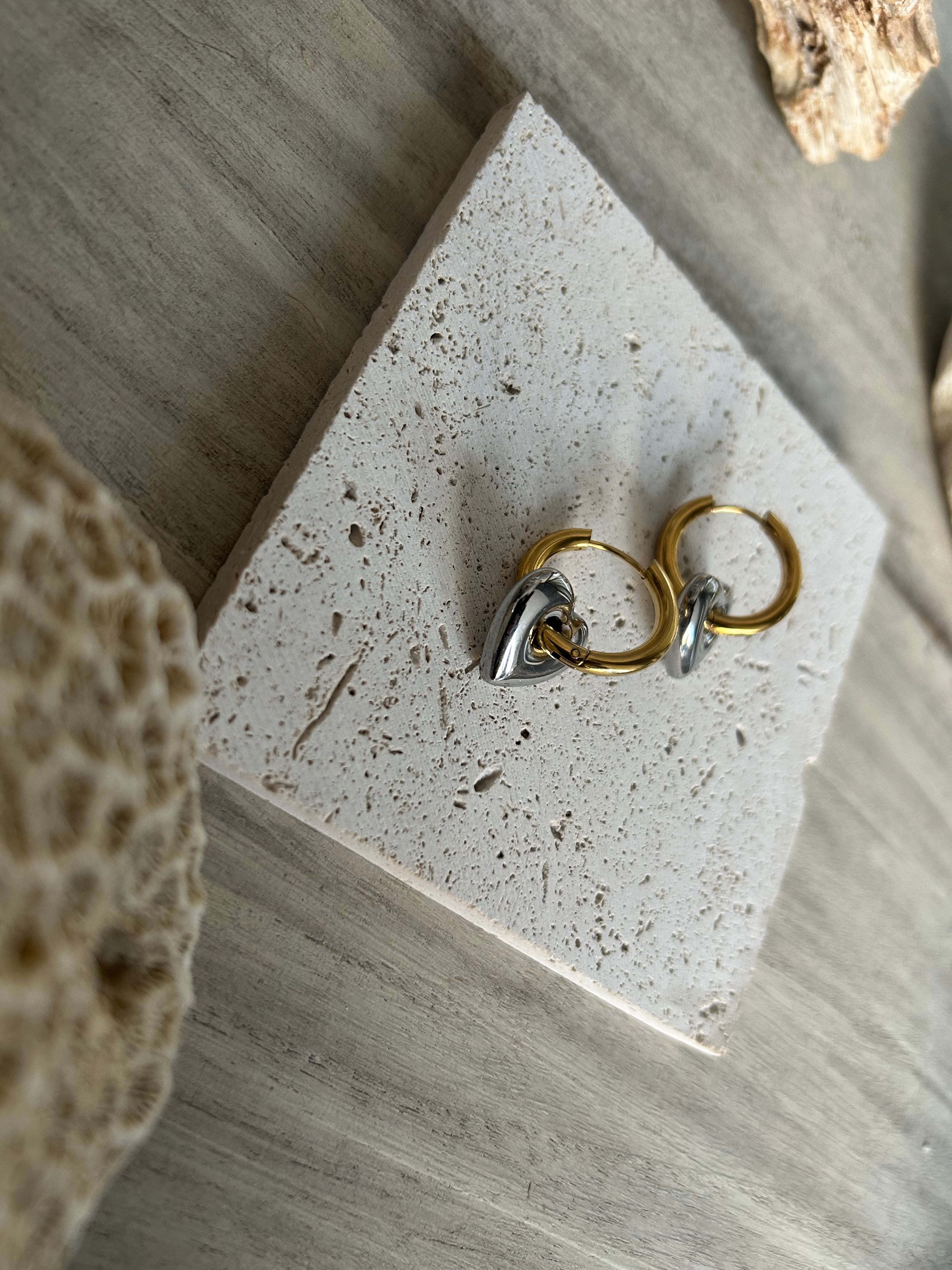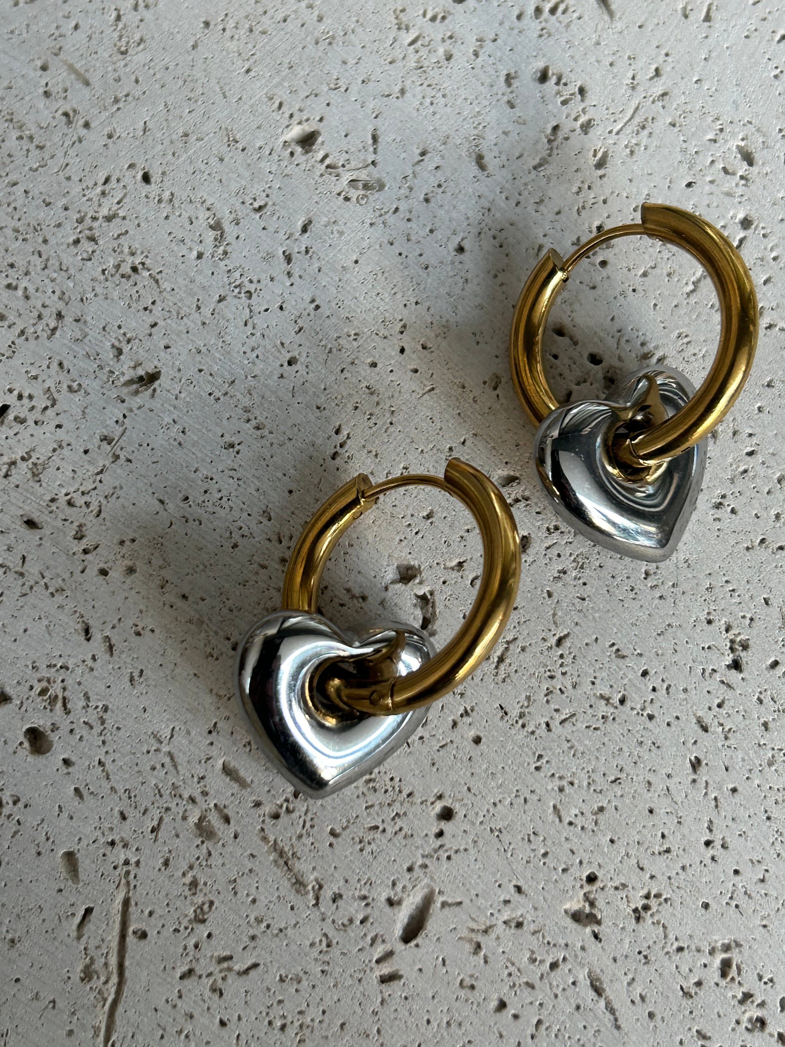 ステンレス製のゴールドのフープとステンレス製のシルバーのハートを合わせたピアスです。